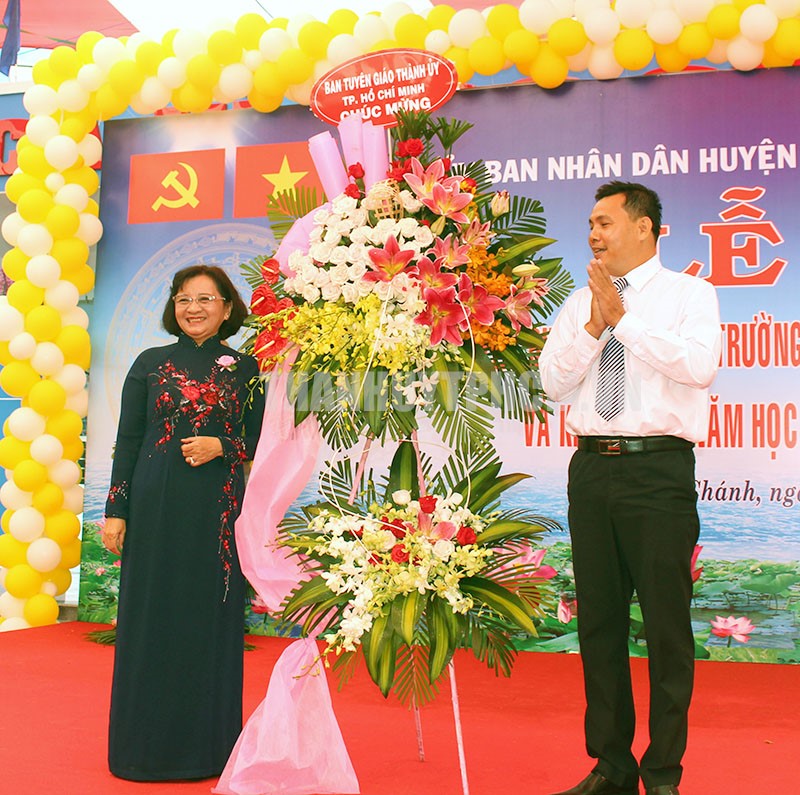 Trưởng Ban Tuyên giáo Thành ủy TPHCM Thân Thị Thư trao tặng lẵng hoa cho thầy Hiệu trưởng Nguyễn Ngọc Huỳnh(Thanhuytphcm.vn) - Sáng 4/9, UBND huyện Bình Chánh tổ chức Lễ công bố quyết định thành lập Trường Tiểu học Huỳnh Văn Bánh và khai giảng năm học mới 2018-2019. Đến dự có các đồng chí: Thân Thị Thư, Ủy viên Ban Thường vụ Thành ủy, Trưởng Ban Tuyên giáo Thành ủy TPHCM; Lê Văn Minh, Phó Bí thư Huyện ủy huyện Bình Chánh; Phan Thị Cẩm Nhung, Phó Chủ tịch UBND huyện Bình Chánh cùng lãnh đạo các ban, ngành của huyện, xã… Đặc biệt, còn có bà Huỳnh Minh Trúc và bà Huỳnh Thị Nhã, là 2 người con gái của liệt sĩ Huỳnh Văn Bánh.