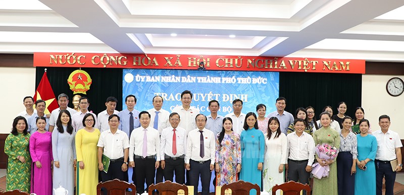 Lãnh đạo TP Thủ Đức chụp hình lưu niệm cùng các đồng chí nhận quyết định.(Thanhuytphcm.vn) - Chiều 10/11, UBND TP Thủ Đức tổ chức hội nghị công bố và trao các quyết định điều động, bổ nhiệm cán bộ của các cơ quan chuyên môn, tổ chức hành chính mới được thành lập, các cơ quan chuyên môn được tổ chức lại và đổi tên thuộc UBND Thủ Đức.