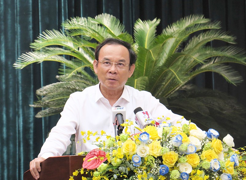 Bí thư Thành ủy TPHCM Nguyễn Văn Nên phát biểu tại Hội nghị triển khai thực hiện Nghị quyết 98/2023/QH15 do Thành ủy TPHCM tổ chức. (Ảnh: Minh Hiệp)(Thanhuytphcm.vn) - Ban Thường vụ Thành ủy TPHCM vừa ban hành Quyết định số 1519-QĐ/TU thành lập Ban Chỉ đạo, Ban Điều hành và Tổ giúp việc triển khai thực hiện Nghị quyết 98/2023/QH15 của Quốc hội về thí điểm một số cơ chế, chính sách đặc thù phát triển TPHCM.