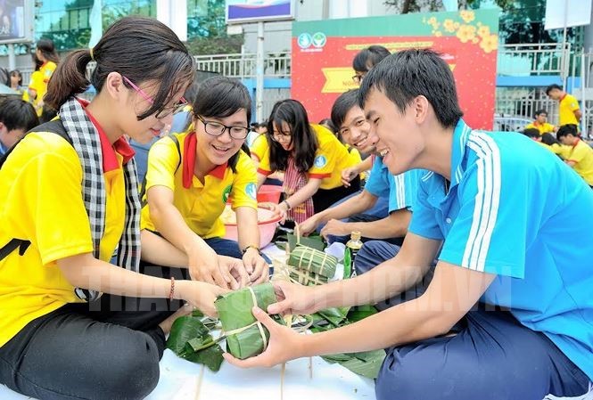 Chiến sĩ Xuân tình nguyện 2018 gói bánh chưng tặng sinh viên xa nhà và người dân có hoàn cảnh khó khăn. (Ảnh: Tùng Nguyễn)(Thanhuytphcm.vn) - Chiều 16/3, Hội Sinh viên TPHCM đã tổ chức hội nghị tổng kết 10 năm chiến dịch Xuân tình nguyện (2009 - 2018).