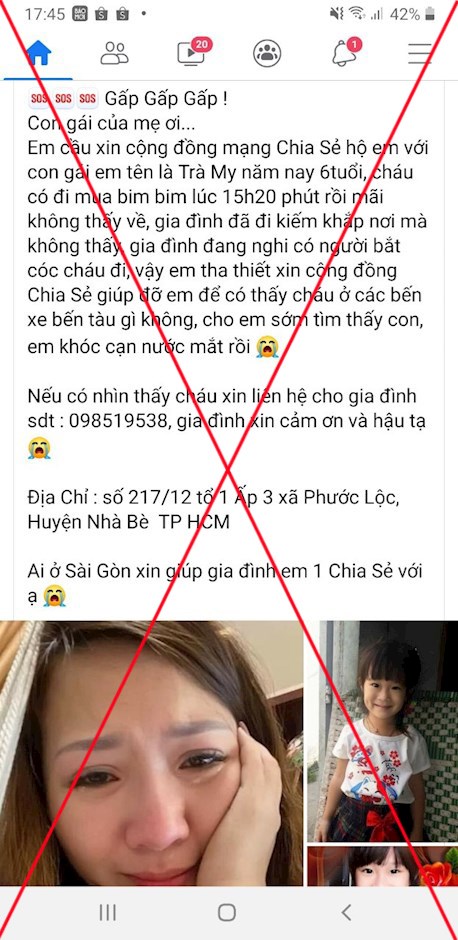 Ảnh chụp lại trên Facebook(Thanhuytphcm.vn) - Tối 19/8, UBND xã Phước Lộc, huyện Nhà Bè đã phản hồi vụ việc liên quan đến trên mạng xã hội có xuất hiện một tài khoản đăng vào chiều 19/8 với nội dung “gấp gấp gấp! con gái của mẹ ơi… em cầu xin cộng đồng mạng chia sẻ hộ em với, con gái em tên Trà Mi năm nay 6 tuổi cháu có đi mua bim bim lúc 15h20 phút rồi mãi không thấy về, gia đình đã đi kiếm khắp nơi mà không thấy, gia đình đang nghi ngờ có người bắt cóc cháu đi, vậy em tha thiết xin cộng đồng chia sẻ giúp đỡ em để có thấy cháu ở các bến xe tàu gì không cho em sớm tìm thấy con em khóc cạn nước mắt rồi nếu có nhìn thấy cháu xin liên hệ cho gia đình số điện thoại 098519538 gia đình xin cảm ơn và hậu tạ