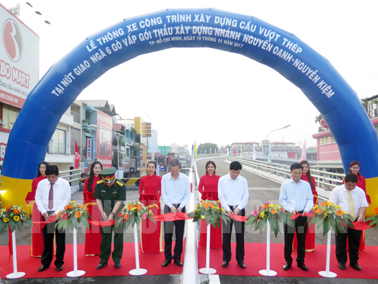 (Thanhuytphcm.vn) - Sáng 19/1, sau 4 tháng thi công, nhánh 1 Nguyễn Oanh - Nguyễn Kiệm của cầu vượt ngã sáu Gò Vấp TPHCM đã được khánh thành và đưa vào khai thác, góp phần giải quyết tình trạng ùn tắc giao thông diễn ra thường xuyên tại khu vực này. Đến dự có Thứ trưởng Bộ GTVT Nguyễn Ngọc Đông, Phó Chủ tịch UBND TPHCM Lê Văn Khoa.