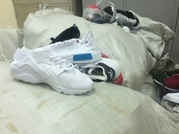 Tại thời điểm kiểm tra, trong kho hàng của ông Hùng đang cất giữ khoảng 1.500 đôi giầy thể thao có dấu hiệu giả các nhãn hiệu như Adidas, Nike...