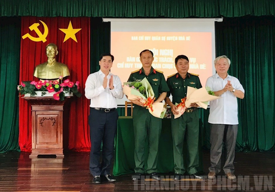 Lãnh đạo huyện Nhà Bè tặng hoa chúc mừng và động viên đồng chí Thượng tá Cao Văn Phát và Thượng tá Hồ Tấn Tường(Thanhuytphcm.vn) - Chiều 9/4, Ban Chỉ huy Quân sự huyện Nhà Bè đã tổ chức hội nghị bàn giao chức trách, nhiệm vụ Chỉ huy trưởng Ban Chỉ huy Quân sự huyện Nhà Bè. Đến dự có Đại tá Nguyễn Tuấn Bảo, Phó Chính ủy Bộ Tư lệnh TPHCM; Bí thư Huyện ủy huyện Nhà Bè Dương Thế Trung; Phó Bí thư Huyện ủy, Chủ tịch UBND huyện Nhà Bè Triệu Đỗ Hồng Phước.