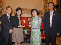 Bà Tưởng Lệ Vân trao quà lưu niệm cho Chủ tịch HĐND TPHCM Phạm Phương Thảo tại buổi tiếp(Website TU) – Chiều 16-9, Chủ tịch HĐND TPHCM Phạm Phương Thảo đã tiếp đoàn Đại biểu Liên minh Dân chủ Xây dựng Hồng Kông (DAB) do bà Tưởng Lệ Vân, Phó Chủ tịch Liên minh, Nghị sĩ Quốc hội Hồng Kông dẫn đầu nhân dịp đoàn đến thăm và khảo sát tình hình hợp tác kinh tế, văn hóa xã hội tại TPHCM.