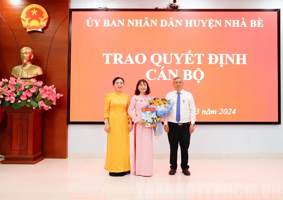 Đồng chí Lê Thị Anh Thư và đồng chí Võ Phan Lê Nguyễn trao Quyết định và hoa chúc mừng đồng chí Nguyễn Thị Hoàng Dung(Thanhuytphcm.vn) - Sáng 18/3, UBND huyện Nhà Bè đã tổ chức trao Quyết định bổ nhiệm Phó Trưởng Phòng Giáo dục và Đào tạo huyện. Tham dự buổi lễ có các đồng chí: Nguyễn Văn Trường, Ủy viên Ban Thường vụ Huyện ủy, Phó Chủ tịch HĐND huyện; Lê Thị Anh Thư, Ủy viên Ban Thường vụ Huyện ủy, Phó Chủ tịch UBND huyện; Võ Phan Lê Nguyễn, Ủy viên Ban Thường vụ Huyện ủy, Phó Chủ tịch UBND huyện; Võ Văn Do, Phó Trưởng Ban Tổ chức Huyện ủy.