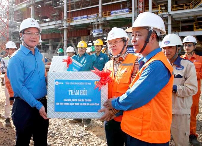 Chủ tịch Tổng Liên đoàn Lao động Việt Nam Nguyễn Đình Khang thăm hỏi công nhân thi công dự án Trung tâm Điện lực Quảng Trạch