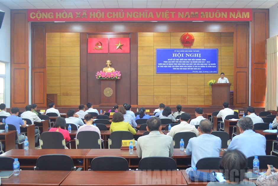 (Thanhuytphcm.vn) - Chiều 15/3, UBND quận Thủ Đức tổ chức hội nghị sơ kết kết quả triển khai thực hiện chương trình phân loại chất thải rắn sinh hoạt tại nguồn năm 2017-2018 và triển khai kế hoạch thực hiện phân loại chất thải rắn sinh hoạt tại nguồn và thực hiện cuộc vận động nhân dân không xả rác ra đường và kênh rạch trên địa bàn quận năm 2019 (ảnh).