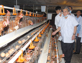 Phó Chủ tịch Nguyễn Trung Tín tham quan mô hình hợp tác sản xuất trứng gà giữa công ty Ba Huân và Trung tâm Phú Văn
