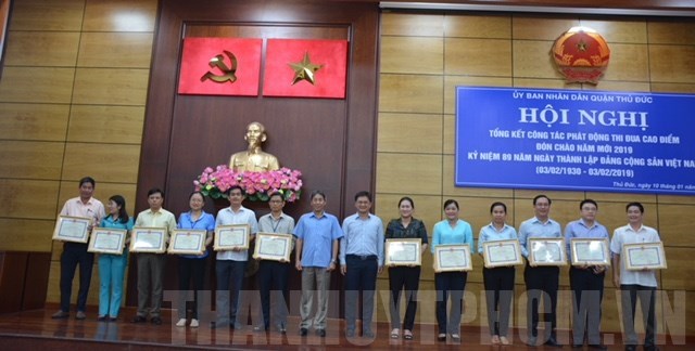 Khen thưởng các tập thể xuất sắc trong đợt thi đua cao điểm(Thanhuytphcm.vn) - Chiều 10/1, UBND quận Thủ Đức đã tổ chức hội nghị tổng kết công tác phát động lễ thi đua cao điểm đón chào năm mới 2019 và kỷ niệm 89 năm Ngày thành lập Đảng Cộng sản Việt Nam (3/2/1930 – 3/2/2019). Các đồng chí: Nguyễn Mạnh Cường, Bí thư Quận ủy Thủ Đức; Đặng Nguyễn Thanh Minh, Chủ tịch UBND quận Thủ Đức đã tham dự.