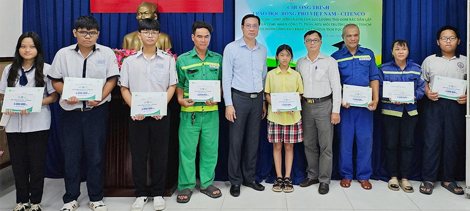 Trao học bổng cho các em học sinh và phụ huynh là công nhân quét, thu gom, vận chuyển rác tại Chi nhánh Môi trường đô thị Gia Định - đại diện cho các em học sinh(Thanhuytphcm.vn) - Sáng 30/8, Công ty TNHH MTV Môi trường đô thị TPHCM (CITENCO) phối hợp với Liên minh Tái chế Bao bì Việt Nam (PRO VIỆT NAM) tổ chức Chương trình trao Học bổng “PRO VIỆT NAM - CITENCO” dành cho học sinh - sinh viên là con của lực lượng thu gom rác dân lập và con của công nhân Công ty TNHH MTV Môi trường đô thị TPHCM có hoàn cảnh khó khăn đạt thành tích học tập tốt.