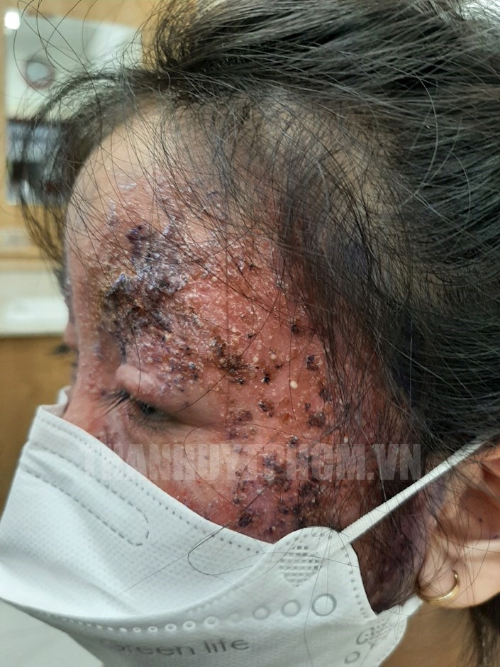 Bệnh nhi tên B.V.B.Y. (8 tuổi, ngụ tại Đồng Nai) được ba mẹ đưa đến BV Da liễu TPHCM khám trong tình trạng da vùng mặt bị tổn thương nặng do điều trị sai cách. Mẹ bé cho biết ban đầu, bé Y. bị phát ban và lấm chấm ít mụn mủ ở vùng mắt, thái dương trái khoảng 1-2 cm. Do dịch bệnh, chị ngại đưa bé đến BV khám nên ra nhà thuốc và được nhân viên nhà thuốc bán thuốc bôi. Sau bôi vài ngày tình trạng da có cải thiện nhưng mấy ngày sau lại bùng phát dữ dội hơn, da bé sần sùi, đóng mày, bưng mủ kèm ngứa... lan ra khoảng 2/3 khuôn mặt bé. Lo lắng nên gia đình vội đưa bé lên BV Da Liễu TPHCM để khám.