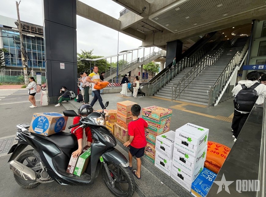 Nhà ga metro trở thành điểm tiếp nhận hàng hóa hỗ trợ bà con vùng lũ.