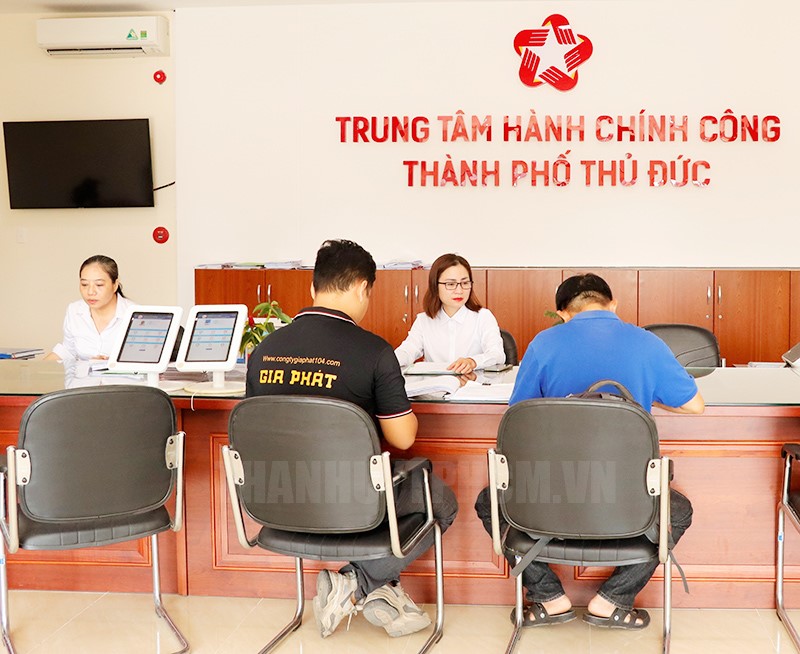 Cán bộ, công chức hướng dẫn người dân thực hiện các thủ tục hành chính.Cũng trong năm, UBND TP Thủ Đức đã thành lập Trung tâm Hành chính công TP Thủ Đức. Đây là mô hình trung tâm hành chính công đầu tiên của TPHCM, thực hiện chức năng tiếp nhận, trả kết quả và giải quyết một số thủ tục hành chính. Việc ra mắt Trung tâm Hành chính công là cột mốc quan trọng thể hiện quyết tâm của TP Thủ Đức là xây dựng một nền hành chính phục vụ ngày càng tốt hơn. Đây được xem là mô hình rất đặc biệt. Thay vì quy trình tiếp nhận thủ tục hành chính rồi chuyển về các đơn vị chuyên môn để xử lý như trước đây, Trung tâm Hành chính công sẽ trực tiếp tiếp nhận, giải quyết hoặc chuyển hồ sơ thủ tục hành chính cho các cơ quan, đơn vị có thẩm quyền. Từ đó, sẽ đẩy nhanh tốc độ xử lý thủ tục hành chính, nhất là trong lĩnh vực cấp Giấy phép xây dựng, lĩnh vực đường bộ, lĩnh vực hạ tầng kỹ thuật, lĩnh vực Quy hoạch - Xây dựng, lĩnh vực môi trường,... Hiện tại, Trung tâm đang tiếp nhận 207 thủ tục (gồm các thủ tục hành chính của 15 phòng, ban chuyên môn thuộc UBND TP Thủ Đức).