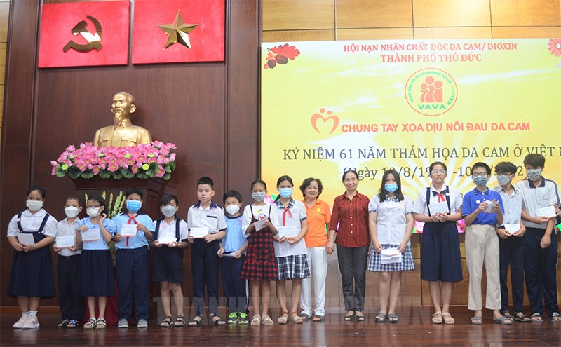Các đồng chí lãnh đạo trao học bổng cho các em học sinh.(Thanhuytphcm.vn) - Chiều 5/8, Hội Nạn nhân chất độc da cam/dioxin TP Thủ Đức tổ chức họp mặt kỷ niệm 61 năm thảm họa da cam ở Việt Nam (10/8/1961 – 10/8/2022). Tham dự họp mặt có các đồng chí: Trần Thị Hà, Phó Chủ tịch Hội Nạn nhân chất độc da cam/dioxin TPHCM; Dương Thanh Dũng, Phó Trưởng ban Dân vận Thành ủy Thủ Đức.