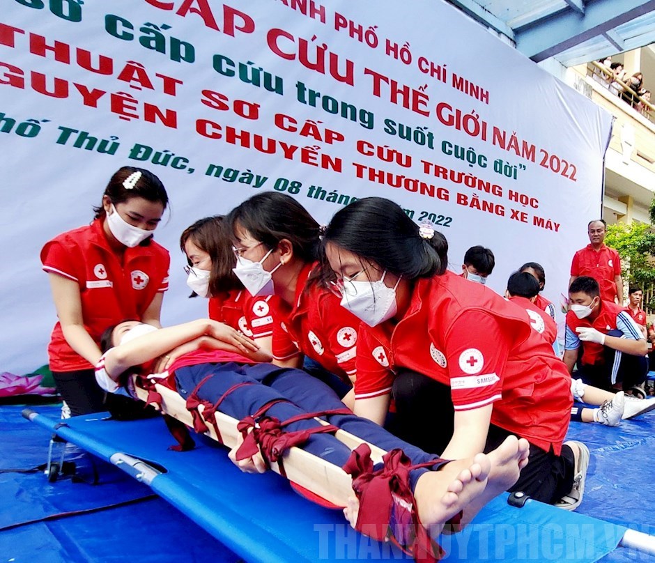 Thao diễn kỹ thuật sơ cấp cứu tại trường học(Thanhuytphcm.vn) - Ngày 8/9, Hội Chữ thập đỏ TP Thủ Đức tổ chức lễ kỷ niệm Ngày Sơ cấp cứu thế giới 2022 (11/9), với chủ đề “Học sơ cấp cứu trong suốt cuộc đời”, thao diễn sơ cấp cứu trường học và ra mắt đội tình nguyện chuyển thương bằng xe máy.