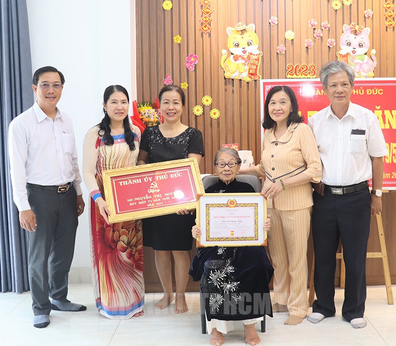 Đồng chí Thái Mỹ Diện trao Huy hiệu 75 năm tuổi Đảng cho đồng chí Nguyễn Thị Nguyệt.(Thanhuytphcm.vn) - Sáng 17/5, đoàn đại biểu Thành ủy Thủ Đức do đồng chí Thái Mỹ Diện, Ủy viên Ban Thường vụ Thành ủy, Phó Chủ tịch HĐND TP Thủ Đức làm trưởng đoàn đến nhà trao tặng Huy hiệu Đảng đợt 19/5/2023 cho các đảng viên cao tuổi tại phường Phước Long B. Cùng đi với đoàn có đồng chí Hà Tuấn Anh, Thành ủy viên, Bí thư Đảng ủy phường Phước Long B.