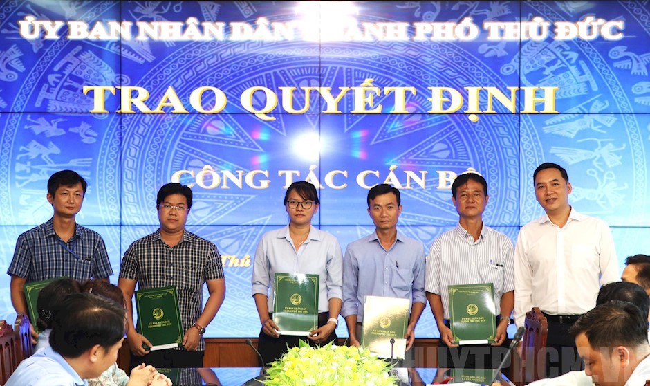 Đồng chí Mai Hữu Quyết (bìa phải) trao quyết định biệt phái cho các công chức(Thanhuytphcm.vn) - Ngày 7/3, đồng chí Mai Hữu Quyết, Thành ủy viên, Phó Chủ tịch UBND TP Thủ Đức chủ trì lễ công bố và trao quyết định cán bộ.