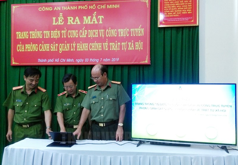 Lãnh đạo Công an TPHCM nhấn nút ra mắt Trang thông tin điện tử.(Thanhuytphcm.vn) - Ngày 3/7, Công an TPHCM tổ chức Lễ ra mắt Trang thông tin điện tử cung cấp dịch vụ công trực tuyến của Phòng Cảnh sát Quản lý hành chính về trật tự xã hội, với địa chỉ truy cập http://qlhc.catphcm.bocongan.gov.vn. Trang thông tin điện tử Phòng Cảnh sát Quản lý hành chính về trật tự xã hội cung cấp 3 nhóm dịch vụ công trực tuyến mức độ 3, (gồm cấp thẻ Căn cước công dân, cấp Giấy chứng nhận đủ điều kiện về an ninh trật tự, đăng ký con dấu).