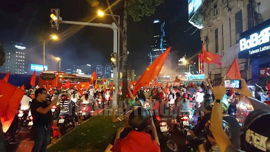 Theo ghi nhận, tại khu vực vòng xoay Hàng Xanh (Bình Thạnh), ngay sau khi trận đấu kết thúc, nhiều người đã tập trung đến các điểm bán cờ Tổ quốc và băng rôn để mua và lên xe chạy về khu vực trung tâm TP. Trên các tuyến đường Điện Biên Phủ, Xô Viết Nghệ Tĩnh, Xa lộ Hà Nội, Quốc lộ 13, Phạm Văn Đồng… nhiều đoàn xe gắn máy mang theo cờ Tổ quốc hô vang “Việt Nam chiến thắng”.