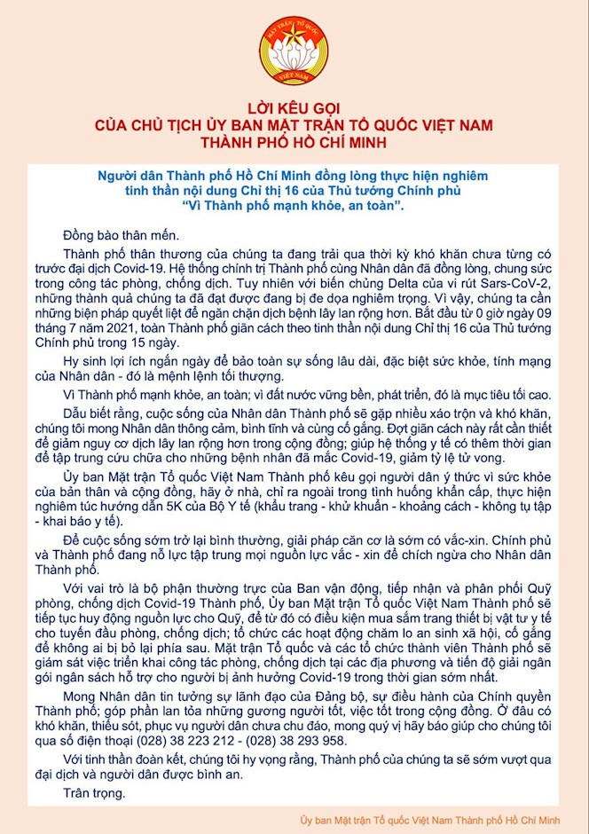 Trong lời kêu gọi, Chủ tịch Ủy ban MTTQ Việt Nam TP Tô Thị Bích Châu nhấn mạnh: “TP đang trải qua thời kỳ khó khăn chưa từng có trước đại dịch COVID-19. Hệ thống chính trị TP cùng Nhân dân đã đồng lòng, chung sức trong công tác phòng, chống dịch. Tuy nhiên với biến chủng Delta virus SARS-CoV-2, những thành quả chúng ta đã đạt được đang bị đe dọa nghiêm trọng. Vì vậy, chúng ta cần những biện pháp quyết liệt để ngăn chặn dịch bệnh lây lan rộng hơn. Bắt đầu từ 0 giờ ngày 9/7/2021, toàn TP giãn cách theo tinh thần nội dung Chỉ thị 16 của Thủ tướng Chính phủ trong 15 ngày”.