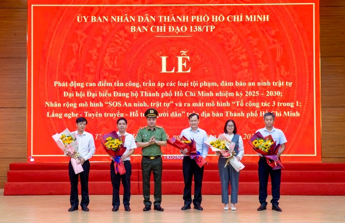 Trung tướng Mai Hoàng tặng hoa chúc mừng Tổ công tác 3 trong 1 các phường Bà Rịa, Long Hương, Tam Long và xã Long Điền, TPHCMNgày 1/10, Ban Chỉ đạo phòng, chống tội phạm và xây dựng phong trào toàn dân bảo vệ an ninh Tổ quốc TPHCM (Ban Chỉ đạo 138) phát động cao điểm tấn công, trấn áp các loại tội phạm; bảo đảm an ninh, trật tự Đại hội đại biểu Đảng bộ TPHCM nhiệm kỳ 2025 - 2030; nhân rộng mô hình “SOS an ninh, trật tự” và ra mắt mô hình “Tổ công tác 3 trong 1: Lắng nghe - Tuyên truyền - Hỗ trợ người dân” trên địa bàn TPHCM.