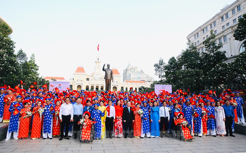 Lãnh đạo TP chụp ảnh lưu niệm với 100 cặp đôi thanh niên, công nhân trong ngày cưới.(Thanhuytphcm.vn) - Nhân kỷ niệm 77 năm Quốc khánh nước Cộng hòa Xã hội Chủ nghĩa Việt Nam (2/9/1945 - 2/9/2022), sáng 2/9, Trung tâm Hỗ trợ Thanh niên Công nhân – Thành đoàn TPHCM tổ chức Chương trình “Lễ cưới tập thể” năm 2022 lần thứ 13 với chủ đề “Tôn vinh nét đẹp văn hóa Việt” cho 100 cặp đôi thanh niên công nhân có hoàn cảnh khó khăn; các tình nguyện viên tham gia phòng, chống dịch Covid-19.