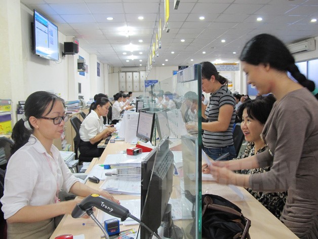 Công chức, viên chức Sở Kế hoạch – Đầu tư TPHCM (mặc áo sơ mi tay dài) giải quyết hồ sơ thủ tục hành chính cho người dân. (Ảnh: Đình Lý)