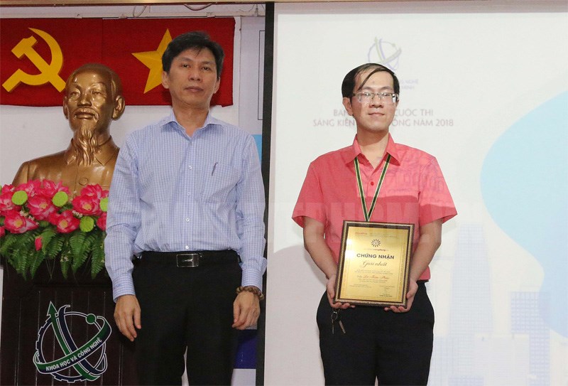 Giám đốc Sở Khoa học và Công nghệ TPHCM Nguyễn Việt Dũng trao giải nhất cho tác giả Lê Thiên Phúc(Thanhuytphcm.vn) - Ngày 26/12, tại TPHCM, 14 tác giả có những sản phẩm, mô hình, giải pháp sáng tạo cùng các tác phẩm báo chí truyền thông hay đã được trao giải thưởng trong cuộc thi Sáng kiến cộng đồng năm 2018.
