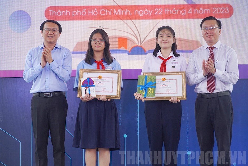 Giám đốc Sở Thông tin - Truyền thông Lâm Đình Thắng và Phó Giám đốc Sở Giáo dục - Đào tạo Nguyễn Bảo Quốc trao giải Nhất cho em Hoàng Lê Vy và em Bùi Lưu Bảo Khánh(Thanhuytphcm.vn) - Nằm trong khuôn khổ chuỗi sự kiện chào mừng Ngày Sách và Văn hóa đọc lần II, sáng 22/4, Sở Thông tin - Truyền thông TPHCM phối hợp với Sở Giáo dục - Đào tạo (GD-ĐT) TPHCM tổ chức trao giải Hội thi “Lớn lên cùng sách” lần 8 và “Văn hay chữ tốt” lần 23, năm học 2022-2023 và tọa đàm “Hình thành thói quen đọc sách cho trẻ”.