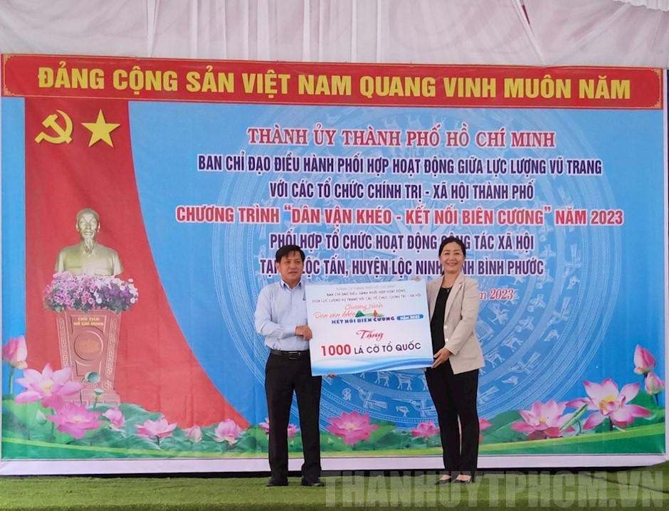 Đồng chí Nguyễn Thị Bạch Mai trao tặng bảng tượng trưng tặng 1.000 lá cờ Tổ quốc(Thanhuytphcm.vn) - Ngày 29/7, tại huyện Lộc Ninh, tỉnh Bình Phước, Ban Chỉ đạo điều hành phối hợp hoạt động giữa lực lượng vũ trang với các tổ chức chính trị-xã hội TPHCM tổ chức chương trình “Dân vận khéo - Kết nối biên cương” năm 2023.