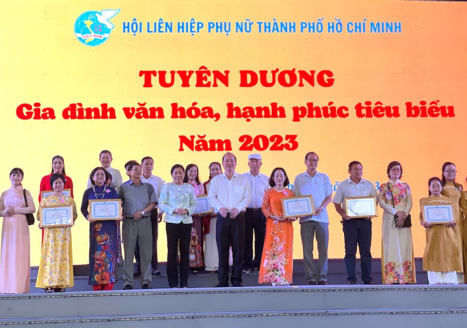 Các đại biểu chụp ảnh lưu niệm với 50 gia đình văn hóa, hạnh phúc tiêu biểu năm 2023Cũng theo đồng chí Nguyễn Thị Phương Hoa, thời gian qua, Hội LHPN TP phối hợp các đơn vị với rất nhiều hoạt động thường xuyên trong cộng đồng dân cư nhằm góp phần xây dựng gia đình hạnh phúc. Theo đó, đã có trên 1.500 gia đình được tuyên dương gia đình hạnh phúc tiêu biểu cấp TP, hơn 24.000 gia đình tuyên dương cấp quận, huyện và hàng chục ngàn gương “Người con hiếu thảo”. Đây là những “tế bào”, những “bông hoa” đẹp, tiêu biểu và có thể còn rất nhiều, rất nhiều những gương tiêu biểu chưa kịp phát hiện tuyên dương vẫn đang lặng lẽ xây dựng gia đình hạnh phúc, giáo dục, hình thành thế hệ mai sau.