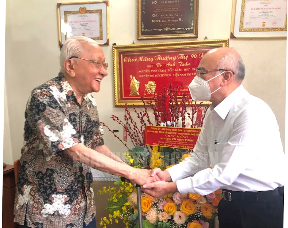 Đoàn đã đến thăm, chúc mừng đồng chí Võ Anh Tuấn (sinh năm 1927, 75 năm tuổi Đảng, ngụ Phường 4, quận Phú Nhuận), nguyên Phó Giám đốc Sở Giáo dục Nam bộ; nguyên Đại sứ, Trưởng Đoàn đại diện Việt Nam tại Liên hiệp quốc, Đại sứ tại Cuba, Zimbabwe, Nam Tư; Vụ trưởng, Cố vấn Bộ Ngoại giao...