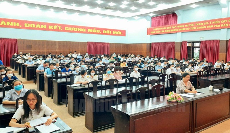 Các đại biểu dự hội nghị tại điểm cầu UBND quận(Thanhuytphcm.vn) - Chiều 1/7, Hội đồng phối hợp phổ biến, giáo dục pháp luật quận Gò Vấp đã tổ chức Hội nghị tập huấn nghiệp vụ hòa giải ở cơ sở cho hơn 600 hòa giải viên cơ sở trên địa bàn quận. Hội nghị được tổ chức theo hình thức trực tuyến tại điểm cầu UBND quận và điểm cầu tại UBND 16 phường.