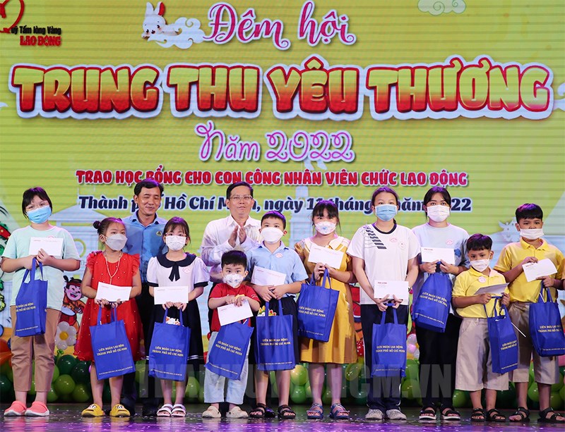 Trao quà và học bổng cho các em thiếu nhi.(Thanhuytphcm.vn) - Tối 11/9, Liên đoàn Lao động (LĐLĐ) TPHCM phối hợp Báo Người Lao Động tổ chức đêm hội Trung thu yêu thương năm 2022 và trao học bổng cho con công nhân, viên chức, lao động có hoàn cảnh khó khăn. Đến dự có nguyên Ủy viên Bộ chính trị, nguyên Phó Thủ tướng Thường trực Chính phủ Trương Hòa Bình; Ủy viên Đoàn Chủ tịch Tổng LĐLĐ Việt Nam, Thành ủy viên, Chủ tịch LĐLĐ TPHCM Trần Thị Diệu Thúy; Ủy viên Ban Thường vụ LĐLĐ TPHCM, Tổng biên tập Báo Người Lao Động Tô Đình Tuân.