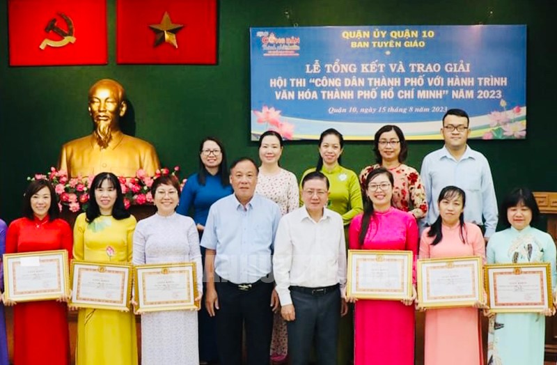 Phó Bí thư Thường trực Quận ủy Nguyễn Bắc Nam cùng các đại biểu trao giải cho các đơn vị.(Thanhuytphcm.vn)- Ngày 15/8, Ban Tuyên giáo Quận ủy Quận 10 tổ chức tổng kết, trao giải Hội thi “Công dân TP với hành trình văn hóa TPHCM” năm 2023 tại Quận 10. Đến dự có Phó Bí thư Thường trực Quận ủy Nguyễn Bắc Nam.