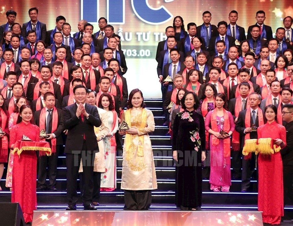 Trao giải thưởng cho các doanh nghiệp trong Top 10 thương hiệu Sao Vàng đất Việt(Thanhuytphcm.vn) - Tiếp tục chăm lo, bồi dưỡng, giáo dục nâng cao nhận thức chính trị, tinh thần tự lực tự cường, lòng yêu nước, tự hào, tự tôn dân tộc, khát vọng Việt Nam, gắn bó với lợi ích của đất nước và sự nghiệp xây dựng chủ nghĩa xã hội của các chủ doanh nghiệp nói chung, doanh nghiệp trẻ nói riêng, yêu cầu trên được Phó Thủ tướng Vương Đình Huệ đưa ra tại Lễ trao Giải thưởng Sao Vàng đất Việt 2018 diễn ra ngày 23/12, tại Hà Nội.