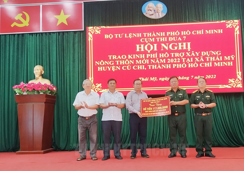 Đại diện các đơn vị trao kinh phí làm đường giao thông liên ấp cho xã Thái Mỹ, huyện Củ Chi.(Thanhuytphcm.vn) - Chiều 29/7, tại hội trường UBND xã Thái Mỹ, huyện Củ Chi Chi, các đơn vị Cụm thi đua 7 Bộ Tư lệnh TPHCM gồm: Ban chỉ huy quân sự (CHQS) Quận 3, Ban CHQS Quận 10, Tiểu đoàn Kiểm soát Quân sự 31; Ban CHQS Công ty lương thực thực phẩm Safogo; Ban CHQS Trường Đại học khoa học tự nhiên TP.HCM tổ chức trao kinh phí thực hiện phong trào “Lực lượng vũ trang (LLVT) TP chung sức xây dựng nông thôn mới” năm 2022.