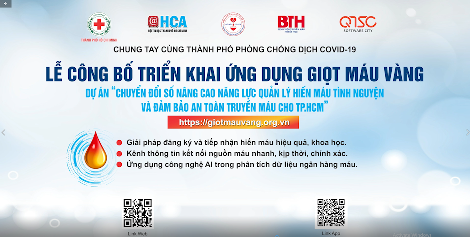 Lễ công bố triển khai Ứng dụng “Giọt máu vàng” - giotmauvang.org.vn(Thanhuytphcm.vn) - Ngày 31/8, Hội Chữ thập đỏ TPHCM phối hợp với Hội Tin học Thành phố tổ chức lễ công bố Dự án “Chuyển đổi số nâng cao năng lực quản lý hiến máu tình nguyện và đảm bảo an toàn truyền máu tại TPHCM” nhằm khắc phục các hạn chế tồn tại trong công tác vận động hiến máu tình nguyện như thiếu máu khẩn, cân đối nguồn cung – cầu máu, các khó khăn trong công tác quản lý, vận động người hiến máu,...