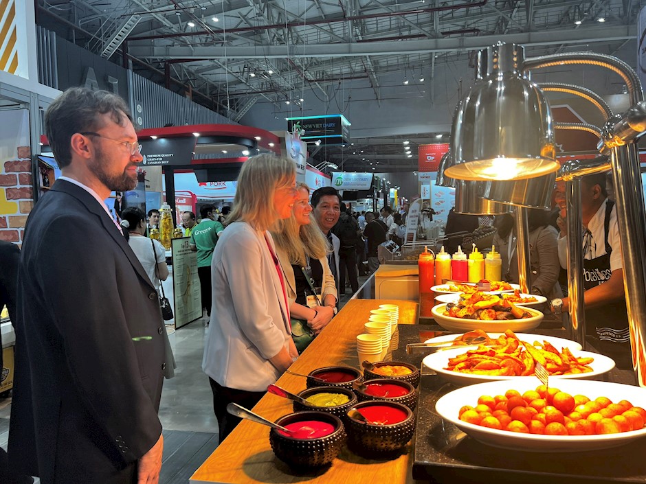 Khách quốc tế tham quan triển lãm(Thanhuytphcm.vn) - Sáng 19/3, tại Trung tâm hội chợ và triển lãm Sài Gòn (SECC, Quận 7, TPHCM) đã khai mạc triển lãm quốc tế lần thứ 12 về thực phẩm, đồ uống, thiết bị làm bánh, nhà hàng, khách sạn và cung ứng dịch vụ - Food & Hotel Vietnam 2024.