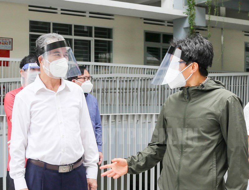 Phó Thủ tướng Vũ Đức Đam cùng đoàn công tác cũng đã tới thăm, kiểm tra công tác phòng chống dịch tại Khu phong tỏa tạm thời ở chung cư Ấn Quang, Phường 9, Quận 10; thăm cơ sở thu dung F0 của Quận 10 tại Trường THCS Nguyễn Văn Tố.