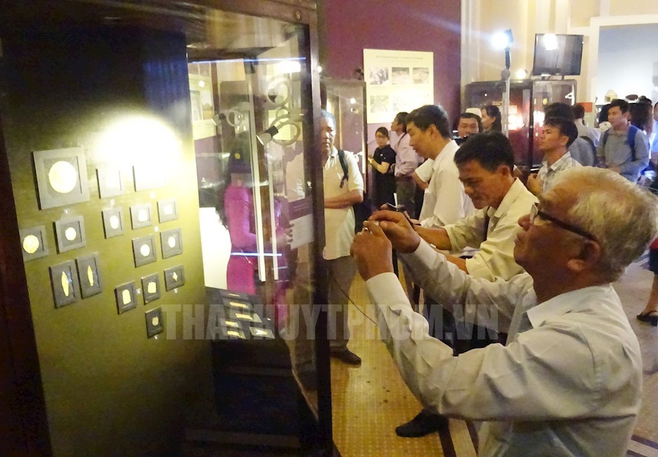 Khách tham quan trưng bày chuyên đề ““Báu vật Vương quốc cổ - Nghệ thuật kim hoàn và trang sức Óc Eo”. (Ảnh: Gia Thuận)(Thanhuytphcm.vn) - Sáng 29/11, Bảo tàng Lịch sử TPHCM đã khai mạc trưng bày chuyên đề “Báu vật Vương quốc cổ - Nghệ thuật kim hoàn và trang sức Óc Eo”, giới thiệu gần 300 hiện vật được phát hiện từ các di tích văn hóa Óc Eo.