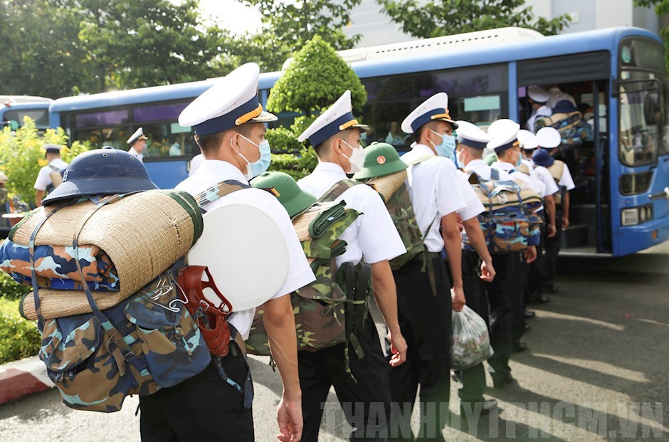 Cán bộ, học viên cơ động lên xe chuẩn bị xuất phát(Thanhuytphcm.vn) - Trước tình hình diễn biến phức tạp của dịch Covid-19 trên địa bàn TPHCM, hưởng ứng phong trào thi đua đặc biệt “Quân đội cùng cả nước chung sức, đồng lòng thi đua phòng, chống và chiến thắng đại dịch Covid-19" do Quân ủy Trung ương, Bộ Quốc phòng phát động, sáng 27/8, tại TPHCM, Trường Cao đẳng Kỹ thuật (CĐKT) Hải quân đã tổ chức cho 200 cán bộ, học viên tham gia phòng, chống dịch trên địa bàn TP.