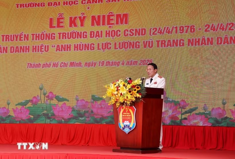 Đại tướng Lương Tam Quang, Ủy viên Bộ Chính trị, Bộ trưởng Bộ Công an phát biểu chỉ đạo tại Lễ kỷ niệm 50 năm Ngày truyền thống Trường Đại học Cảnh sát nhân dân (24/4/1976 -24/4/2026) và đón nhận danh hiệu Anh hùng Lực lượng vũ trang nhân dân. (Ảnh: TTXVN)Ngày 19/4, tại Thành phố Hồ Chí Minh, Trường Đại học Cảnh sát nhân dân long trọng tổ chức Lễ kỷ niệm 50 năm Ngày truyền thống (24/4/1976 - 24/4/2026) và đón nhận danh hiệu Anh hùng Lực lượng vũ trang nhân dân. Đại tướng Lương Tam Quang, Ủy viên Bộ Chính trị, Bộ trưởng Bộ Công an đến dự và trao danh hiệu Anh hùng Lực lượng vũ trang nhân dân cho tập thể lãnh đạo nhà trường.