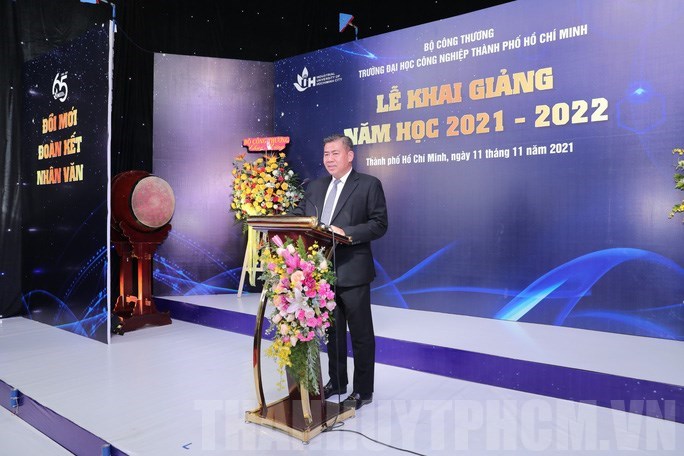 TS. Phan Hồng Hải phát biểu tại Lễ khai giảng(Thanhuytphcm.vn) - Ngày 11/11, Trường Đại học Công nghiệp TPHCM tổ chức lễ đón tân sinh viên và khai giảng năm học 2021 - 2022. Phát biểu tại buổi Lễ, TS. Phan Hồng Hải, Ủy viên Ban Thường vụ Đảng ủy Khối cơ sở Bộ Công Thương tại TPHCM, Bí thư Đảng ủy, Hiệu trưởng nhà trường, cho biết, mặc dù dịch Covid-19 đã khiến cuộc sống bị ảnh hưởng nghiêm trọng nhưng giải pháp “thay đổi để thích nghi” đã giúp nhà trường vượt qua được khó khăn để hoàn thành nhiệm vụ dạy và học. Chất lượng đào tạo, nghiên cứu khoa học tiếp tục được nâng cao. Nhà trường ngày càng khẳng định vị thế của mình với các trường đại học trong nước, trong khu vực và quốc tế. Riêng công tác tuyển sinh năm 2021 đạt kết quả tốt với 8.396 tân sinh viên nhập học (đạt 102,79% so với kế hoạch); chất lượng đầu vào năm nay cao hơn so với năm trước khi điểm chuẩn các ngành học dao động 18,5 - 26 điểm.