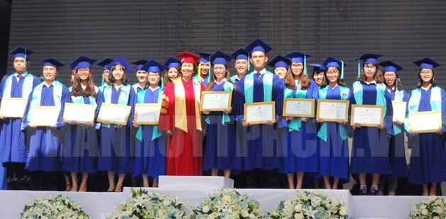 NGƯT.GS.TS Mai Hồng Quỳ, Hiệu trưởng Trường Đại học Luật TPHCM trao giấy khen cho các sinh viên đạt kết quả học tập giỏi toàn khóa.