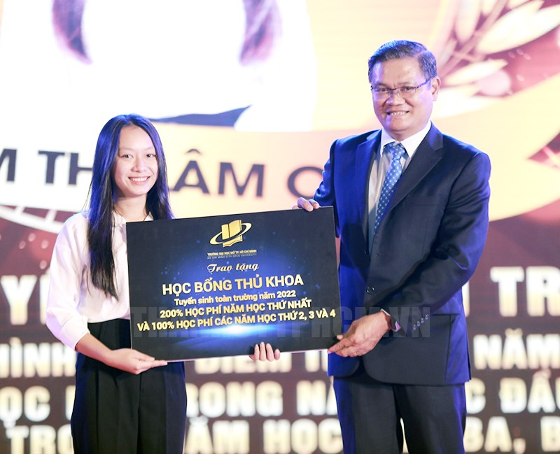 GS.TS Nguyễn Minh Hà, Hiệu trưởng Trường Đại học Mở TPHCM trao học bổng cho các tân sinh viên là thủ khoa(Thanhuytphcm.vn) - Ngày 18/10, Trường Đại học Mở TPHCM tổ chức Lễ Khai giảng năm học mới 2022-2023. Buổi lễ có sự tham gia của hơn 4.500 tân sinh viên.