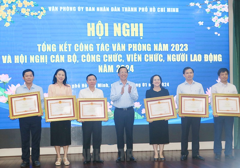 Dịp này, Văn phòng UBND TPHCM tổ chức trao Bằng khen của Thủ tướng Chính phủ cho 6 cá nhân có thành tích xuất sắc trong công tác phòng chống dịch bệnh Covid-19; Bằng khen của Bộ trưởng Bộ Ngoại giao cho 1 tập thể và 1 cá nhân; Kỷ niệm chương Vì sự nghiệp ngoại giao của Bộ Ngoại giao cho 2 cá nhân; trao tặng Bằng khen của Chủ tịch UBND TPHCM cho 54 cá nhân đạt danh hiệu chiến sĩ thi đua cơ sở năm 2023.
