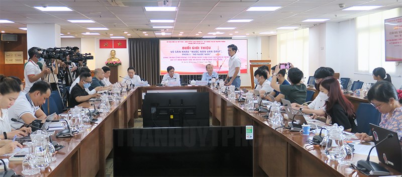 Toàn cảnh buổi giới thiệu vở sân khấu “Nước non vạn dặm”(Thanhuytphcm.vn) - Sáng 23/7, Ban Tuyên giáo Thành ủy TPHCM, Sở Văn hóa và Thể thao, Sở Thông tin và Truyền thông TPHCM phối hợp với Nhà hát Cải lương Việt Nam tổ chức buổi giới thiệu vở sân khấu “Nợ nước non”, phần I trong bộ sử thi nghệ thuật 3 phần mang tên “Nước non ngàn dặm”, sẽ ra mắt công chúng vào ngày 25, 26/7/2022 tại Nhà hát Thành phố.