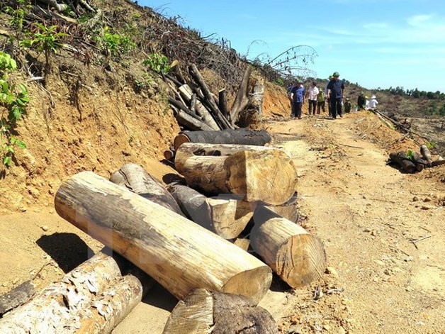 Nhiều khúc gỗ có đường kính lớn còn sót lại tại hiện trường. (Ảnh: TTXVN)